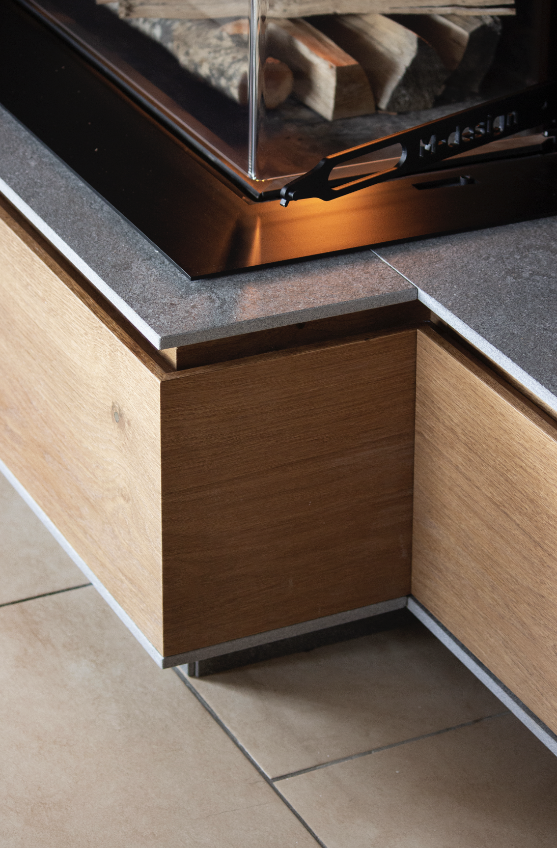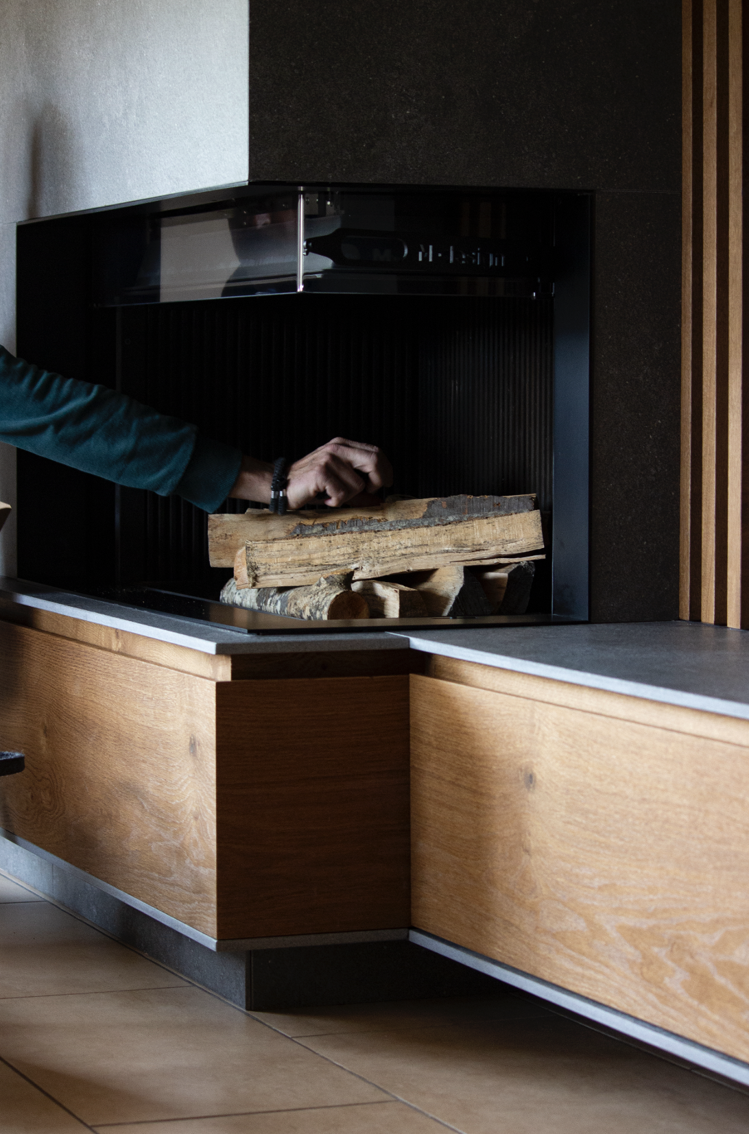 A focandroc© treballem amb les marques més destacades del mercat, oferint uns resultats que garanteixen la durabilitat i les prestacions. En aquest cas, fusionem el porcellànic i la fusta natural, així com una llar de foc amb un ampli accés, que garanteix una accessibilitat extraordinària, tant per omplir de llenya, netejar-la o gaudir de la lluentor de les flames.